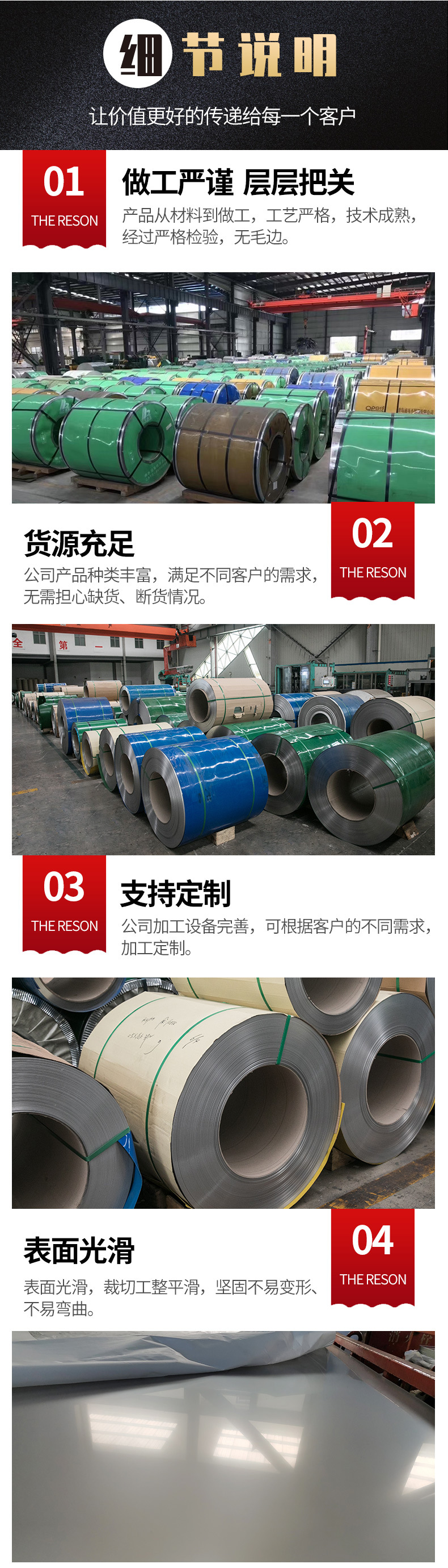 不锈钢卷板分为奥氏体、铁素体、马氏体、双相(铁素体-奥氏体)的不锈钢冷轧卷和不锈钢热轧卷。
